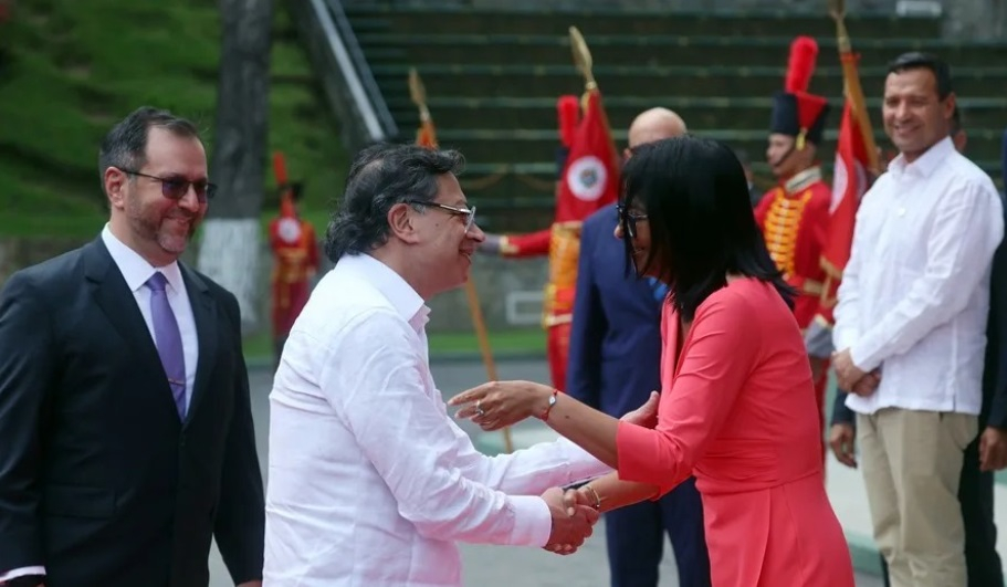 Petro, acompañado por el canciller venezolano, Yván Gil, fue recibido en la entrada de la sede presidencial por Rodríguez, para luego dirigirse a un salón de Miraflores donde llevarán a cabo su reunión.